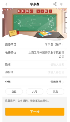 ③输入学生姓名和身份证号码→点击下一步→系统自动显示所交金额→完成缴费即可。